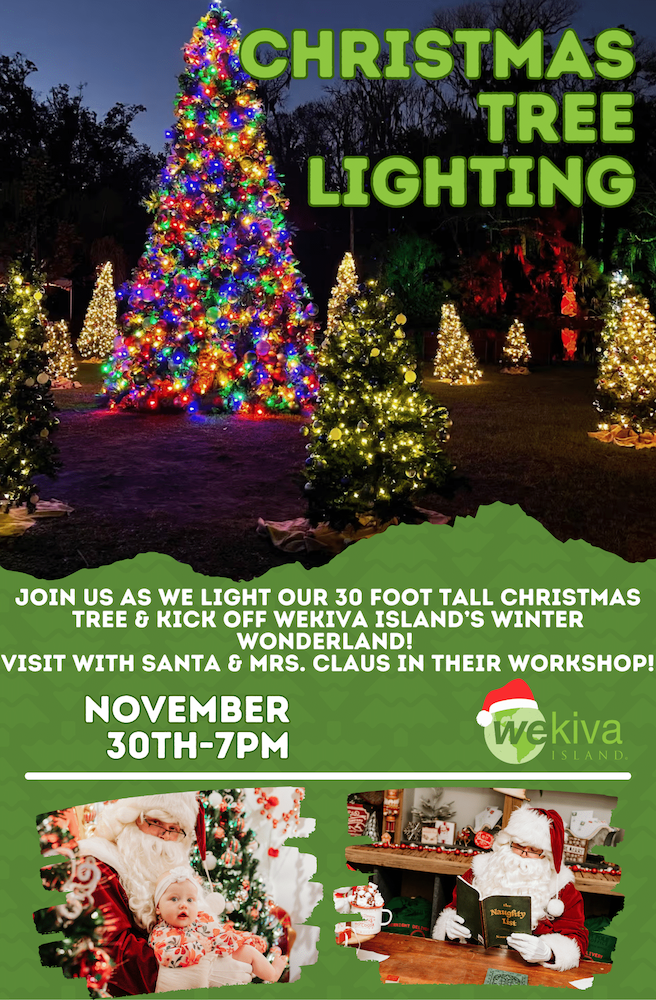 Join us at Wekiva Island as Santa and Mrs. Claus officially kick off the holiday season by lighting our HUGE 30-foot-tall Christmas tree at 7 p.m. The snow flurries will be flying, Stilt walkers will be wandering and there will be plenty of holiday cheer.