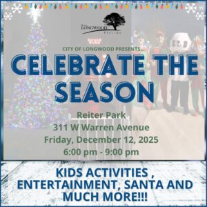 On Friday, December 12, from 6 pm to 9 pm join the festivities at the City of Longwood’s Annual Celebrate the Season Event. This holiday street party will feature an array of activities including photo opportunities with Santa, music by DJ Dennis, live performances, kids activities, and more!