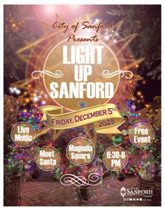 Join us for a magical night at Light Up Sanford, the City’s Tree Lighting Ceremony on Friday, December 5 at 6:00 pm. Experience the enchantment of the Magnolia Square Christmas Tree and downtown as we illuminate the night. Get ready for holiday entertainment, a visit from Ol’ Saint Nick, his helpers, and more!